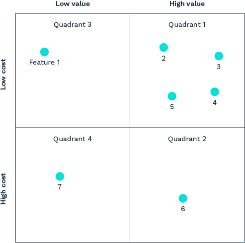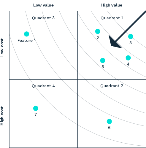 2. It’s obvious that we’ll want to work on Quadrant 1 first, but in what order? You can estimate the order by drawing concentric circles starting in the corner of Highest Value & Lowest Cost. Work your way out from features in the smallest circle to the largest circle. So, in this example, the order is: 3, 2, 4, 5, 6, 1, and 7. This ordering corresponds to working on things with the highest return on investment first.