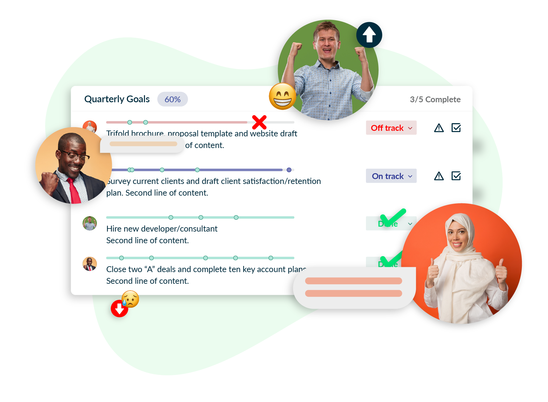 Within our app, you can easily set quarterly goals that sync beautifully within your weekly meetings. It allows you to check the status of your progress with on-track and off-track statuses. Off track? Drop it down to your issues list and discuss what may be in the way or take a context-aware to-do to help get you back on track.