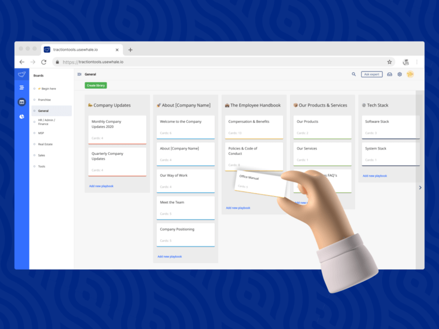 With create, Whale helps you document your processes, procedures and company policies. Our easy-to-use editor helps you create bite-sized dynamic content with text, images, videos and more, so you no longer need to rely on lengthy manuals in binders that no one reads. And with our templates and partner service, you’ll reduce your documentation journey from months to days.